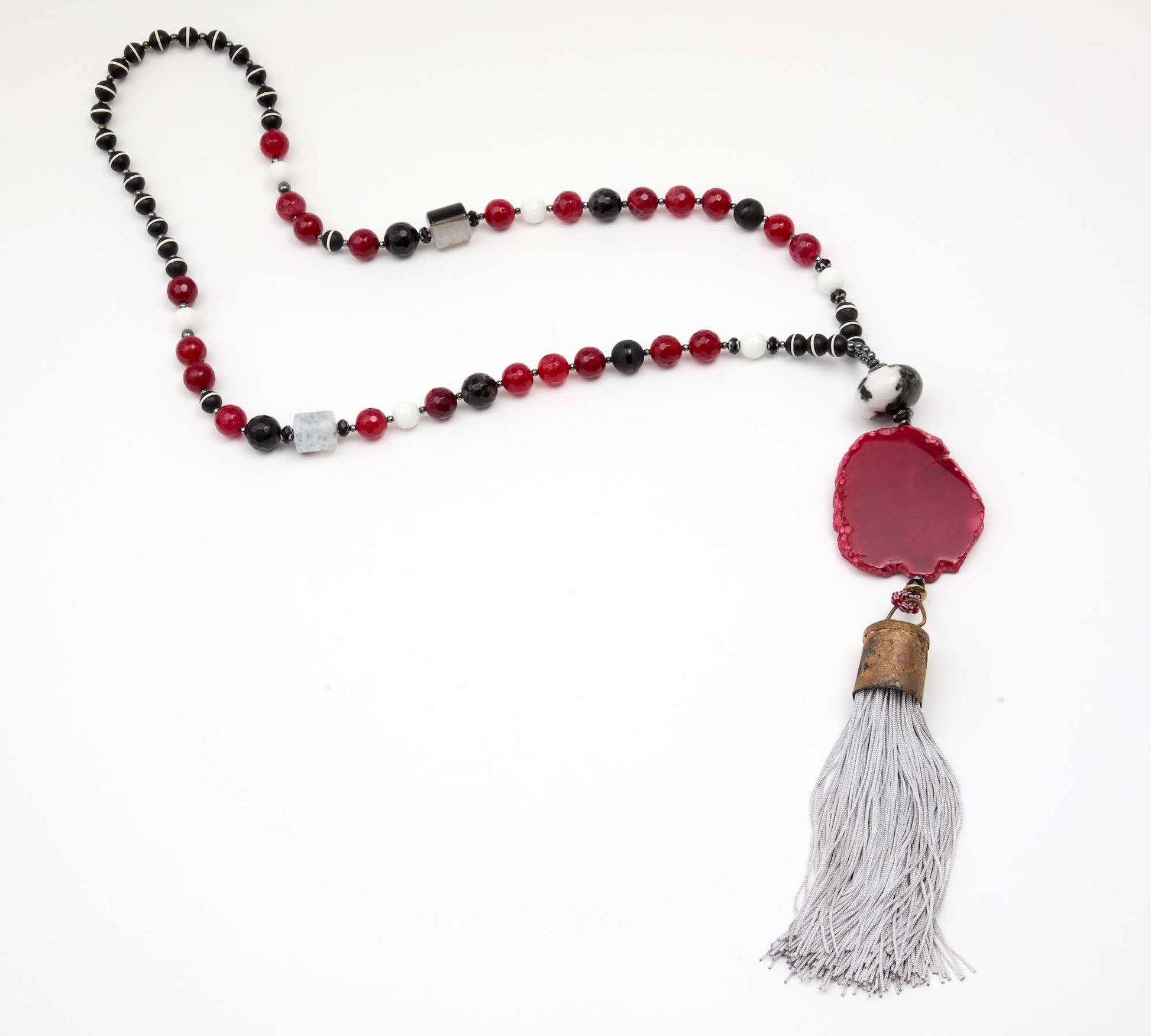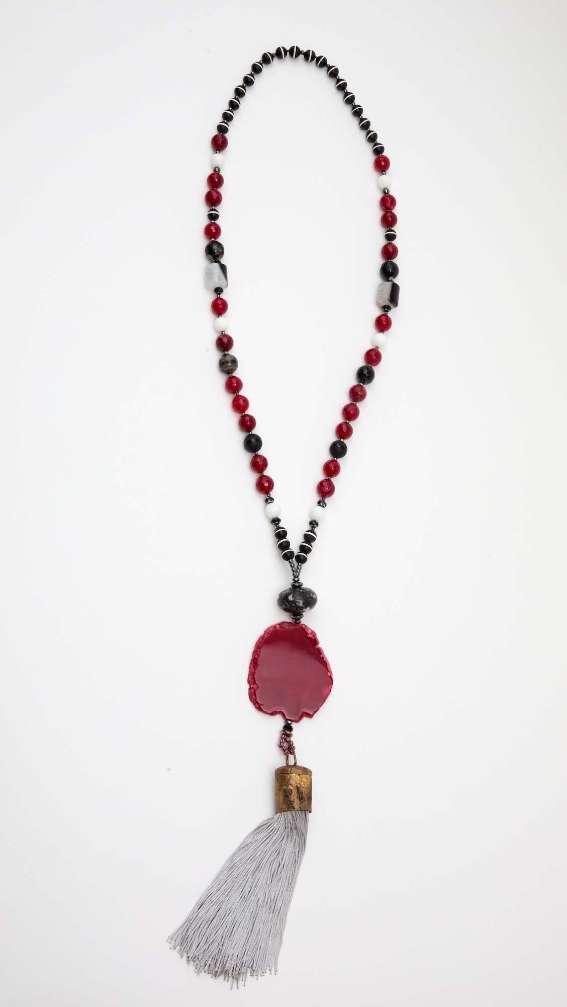 The Alexis Necklace is unapologetically bold, a true showstopper. Tibetan agate beads are combined with a large dyed red agate focal and a large jasper bead, finished with a dramatic grey silk tassel and African seed bead accents. Rich in texture and presence, Alexis is a one-of-a-kind statement piece made to stand out.