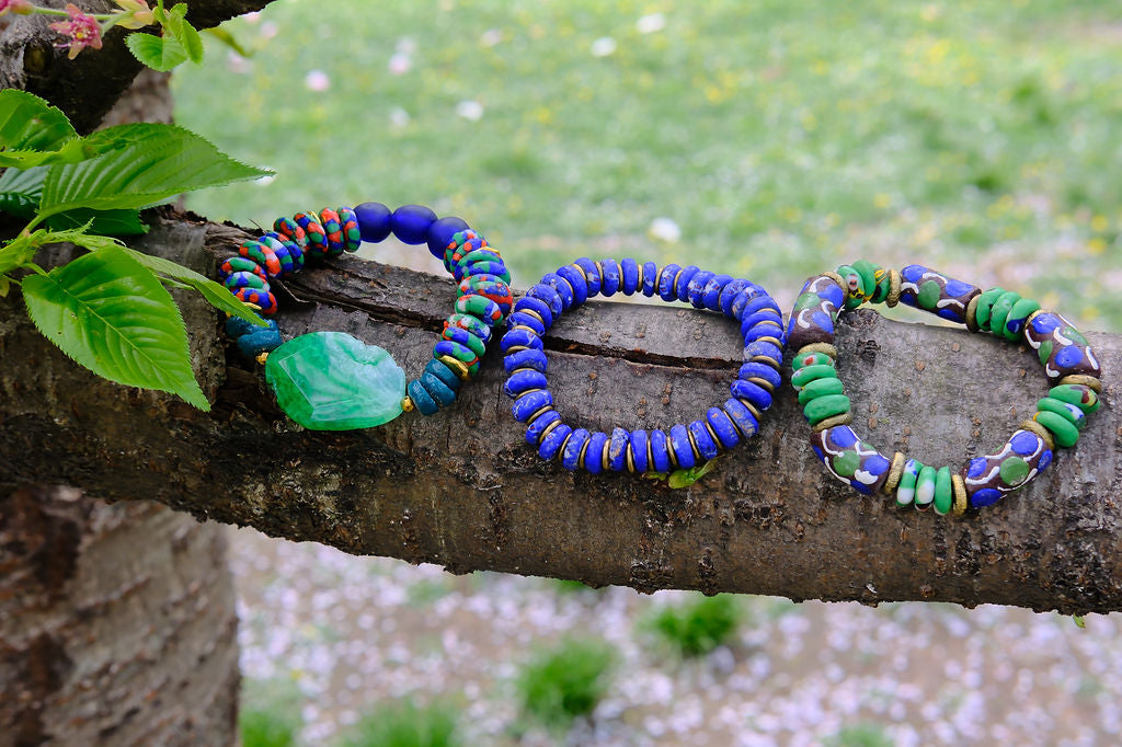 The Omi bracelet is sleek and rooted in tradition. Blue African recycled glass rondelle beads are accented with brass spacers, creating a design that feels both classic and contemporary. Striking in its simplicity, Omi carries the effortless strength of Afro Luxe.